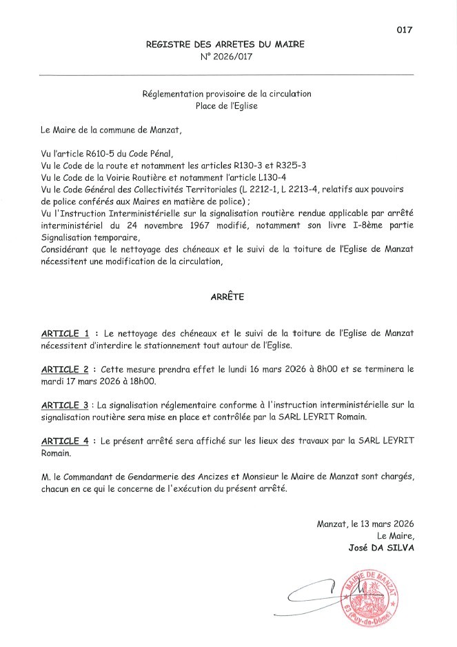En raison du nettoyage des chéneaux et du suivi de la toiture de l’Église de Manzat le lundi 16 et mardi 17 mars, le stationnement sera interdit tout autour de l’Église.