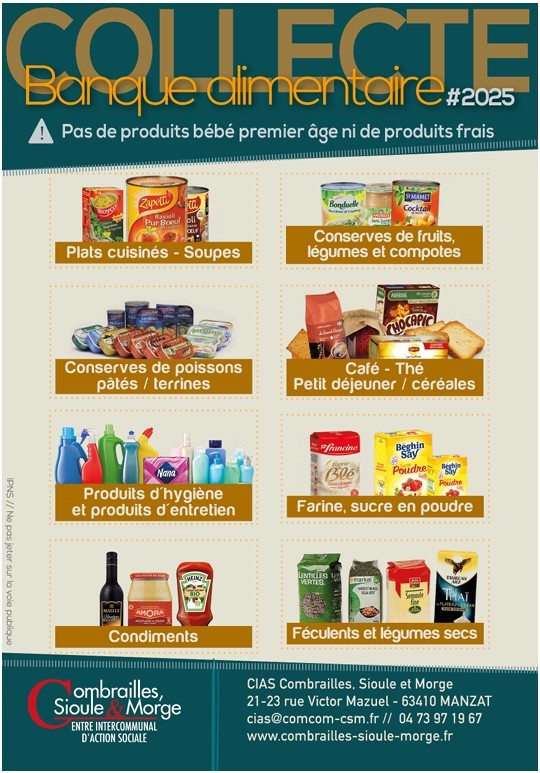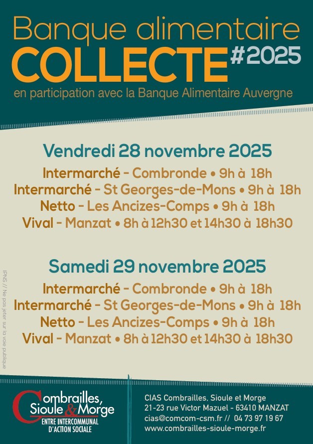 Le CIAS de Combrailles, Sioule et Morge - Communauté de communes organise, comme chaque année, la collecte de la banque alimentaire sur son territoire, en partenariat avec Banques Alimentaires Auvergne Elle aura lieu les vendredi 28 et samedi 29 novembre 2025